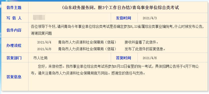 您好,来信收悉。我市事业单位综合类考试将参加5月22日省里的统一考试,具体招聘公告将于4月下旬公布,请关注青岛市人力资源和社会保障局官方网站。感谢您的信任与支持。